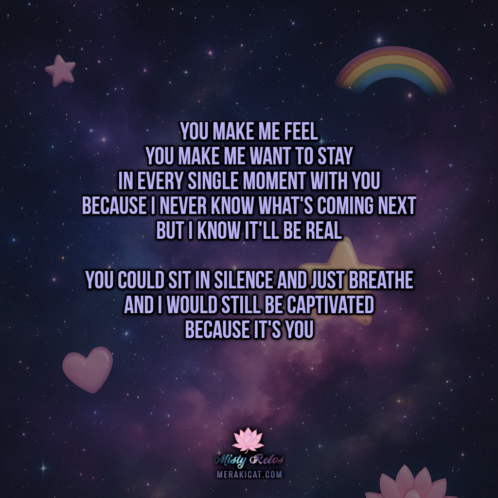 you make me feelyou make me want to stayin every single moment with youbecause I never know what’s coming nextbut I know it’ll be realyou could sit in silence and just breathe,and I would still be captivatedbecause it’s you