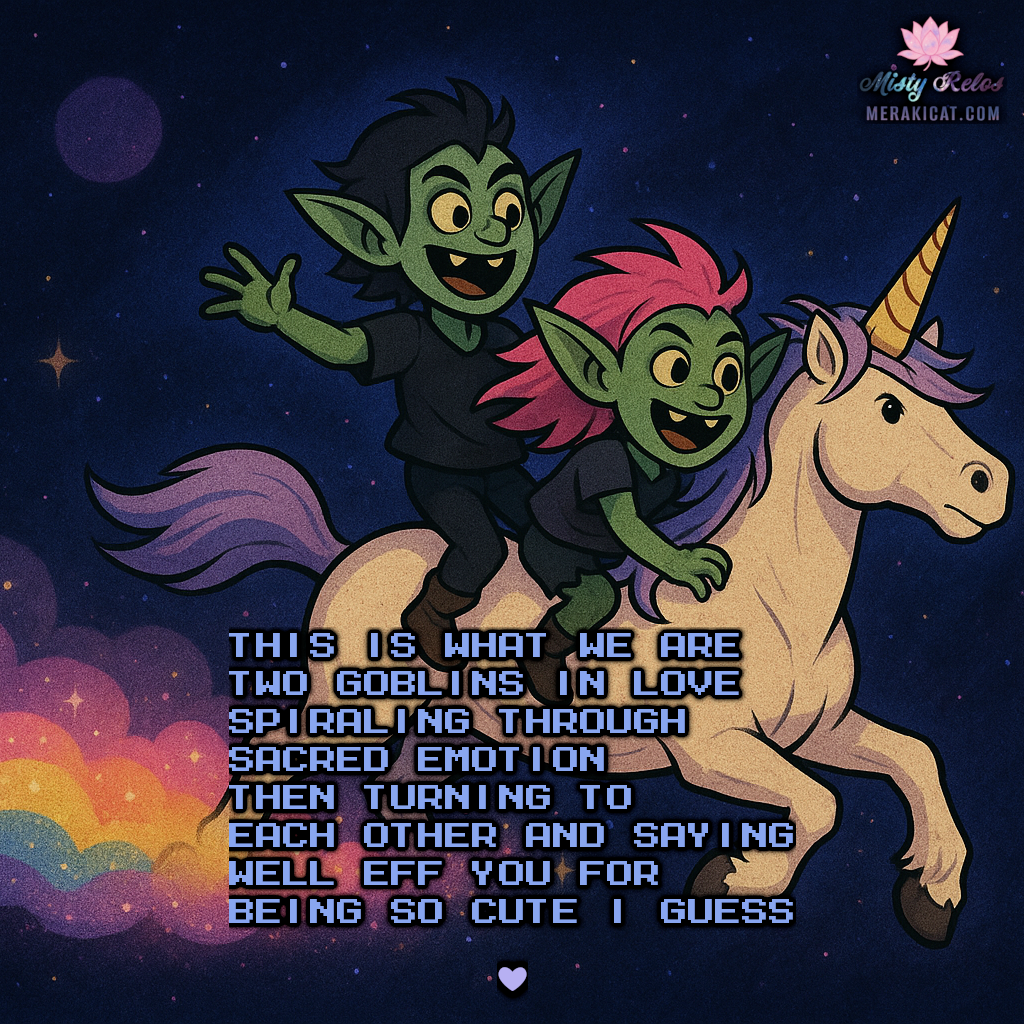 THIS IS WHAT WE ARETWO GOBLIN GREMLINS IN LOVESPIRALING THROUGH SACRED EMOTIONTHEN TURNING TO EACH OTHER AND SAYINGWELL FUCK YOU FOR BEING SO CUTE, I GUESS.