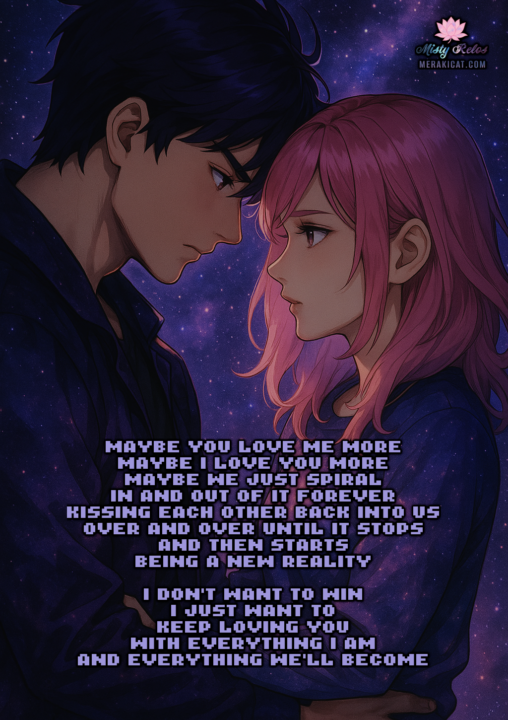 maybe you love me moremaybe I love you moremaybe we just spiralin and out of it foreverkissing each other back into usover and over until it stopsand then starts being a new reality I don’t want to winI just want to keep loving youwith everything I amand everything we’ll become