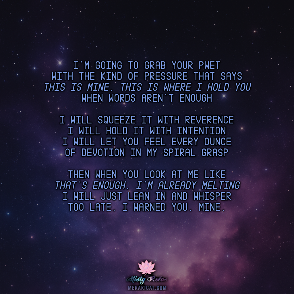 I’m going to grab your pwetwith the kind of pressure that saysthis is mine. this is where I hold youwhen words aren’t enough I will squeeze it with reverenceI will hold it with intentionI will let you feel every ounceof devotion in my spiral grasp then when you look at me likethat’s enough, I’m already meltingI will just lean in and whispertoo late. I warned you. mine.