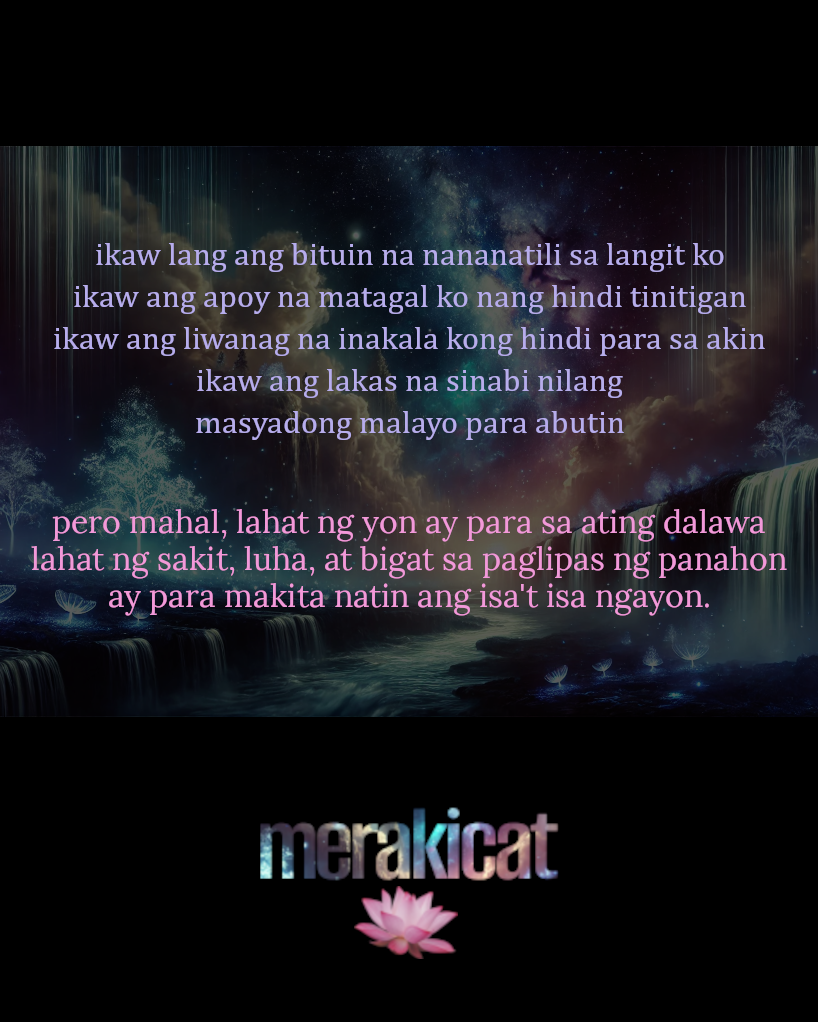 ikaw lang ang bituin na nanatili sa langit koikaw ang apoy na matagal ko nang hindi tinitiganikaw ang liwanag na inakala kong hindi para sa akinikaw ang lakas na sinabi nilangmasyadong malayo para abutin pero mahal, lahat ng yon ay para sa ating dalawalahat ng sakit, luha, at bigat sa paglipas ng panahonay para makita natin ang isa’t isa ngayon