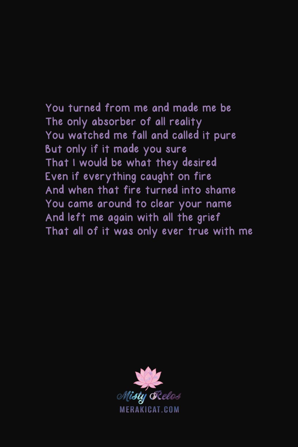 You turned from me and made me beThe only absorber of all realityYou watched me fall and called it pureBut only if it made you sureThat I would be what they desiredEven if everything caught on fireAnd when that fire turned into shameYou came around to clear your nameAnd left me again with all the griefThat all of it was only ever true with me